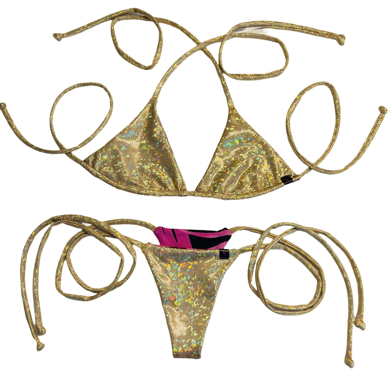 The "Barakini", Studio Bara's signature cheeky reversible bikini made from a repurposed vintage 1-piece tropical suit and gold iridescent spandex. Handmade by Bara Cashmere.