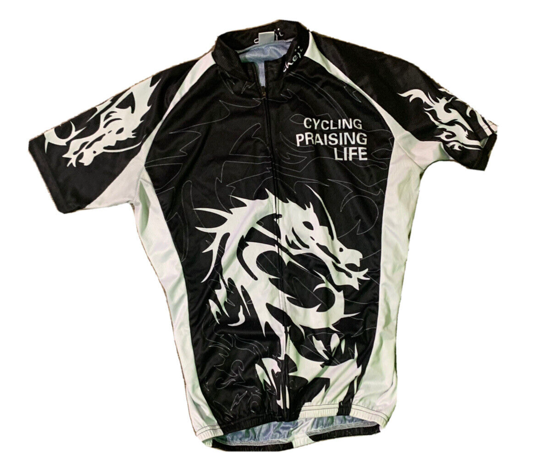 The "Barakini", Studio Bara's Reversible Microbikini made from a repurposed Cheji tribal dragon cycling jersey and silky solid black spandex.